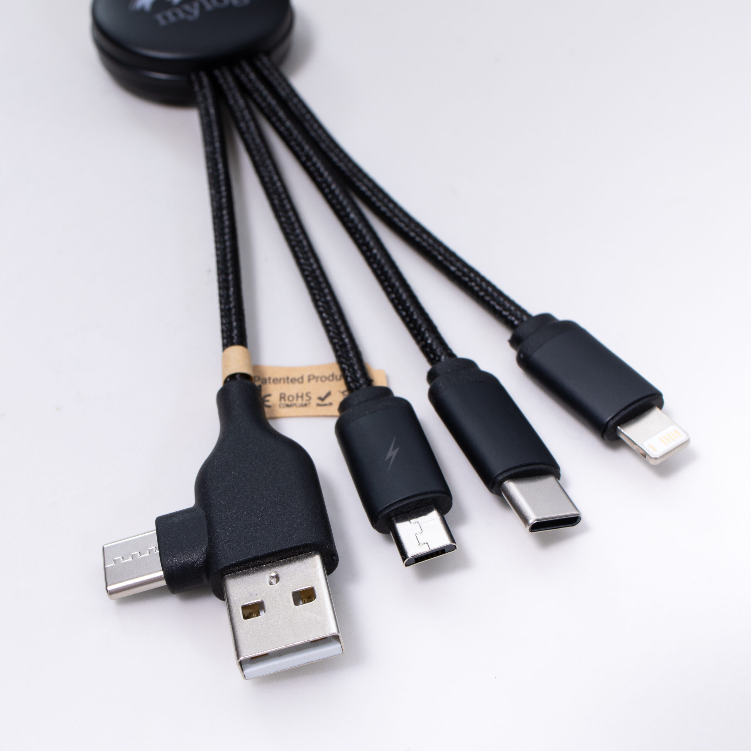 Features : Light-up logo part , Use for charging and data transfer for computers , Macbook , IPDA etc. , 3 outputs , USB-C , Lightning , and Micro USB
